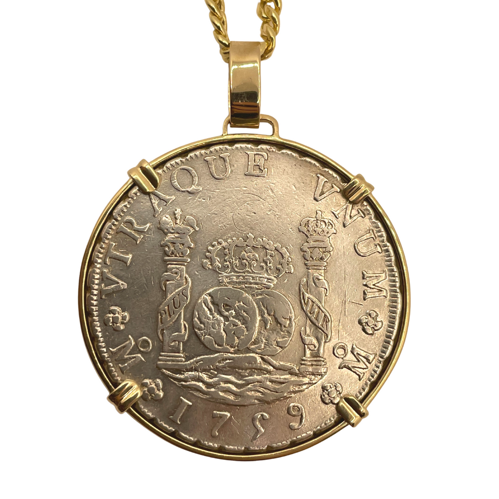 The authentic silver reale columnario was minted in Mexico City, thus thicker than the more recent ones minted in Spain. The size is approximately 40mm wide. The coin is adorned with the classic columns of Hercules and the two globes. Please call 340-776-1140 for more details. The coin is placed in a 14k bale pendant.