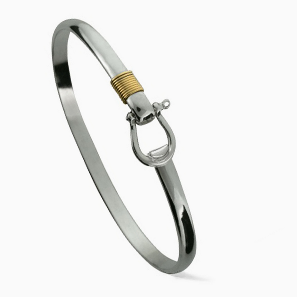The famous Cruzan Bracelets now come in a Shackle Design as befits their home! The new look is made of sterling silver and comes in either all-silver or silver with a 14k gold wrap.